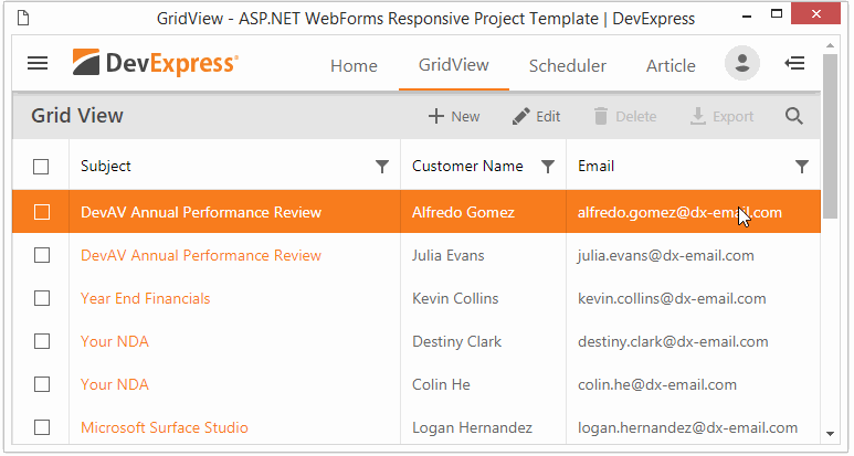 This page demonstrates an adaptive layout that incorporates the ASPxGridView control. The page’s layout includes the following features: